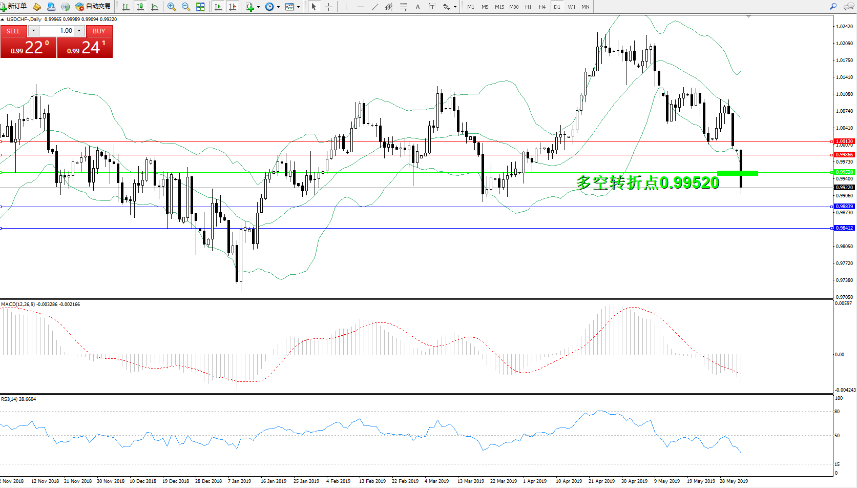 交易策略:0.99520下方看跌,目标0.98839、0.98412