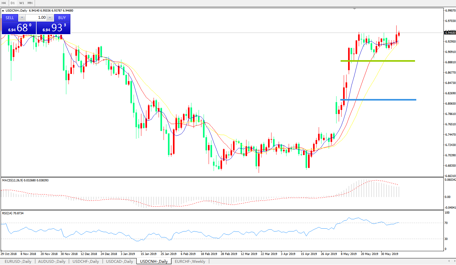 交易策略6.8880之上,看涨,目标价位为6.9600,然后为6.9800
