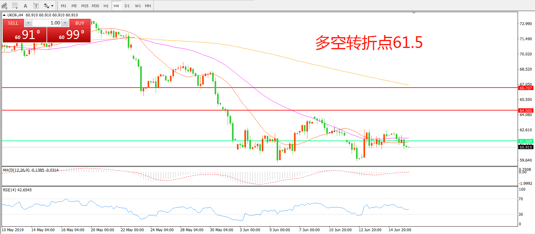 交易策略:在61.50之下看跌,目标57.50    53.00