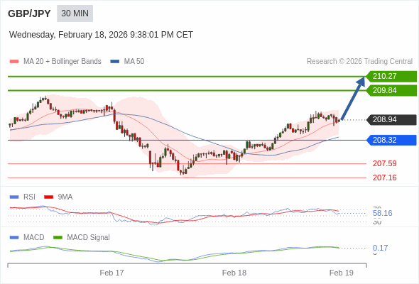 英镑/日元 当日内 : 看涨,当 208.32 为支撑位,目标定在210.27。