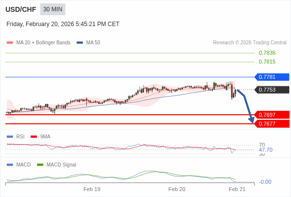 美元/瑞郎 当日内 : 看跌,在 0.7781 之下。