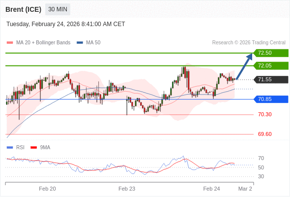 在 70.85 之上,看涨,目标价位为 72.05 ,然后为 72.50 。