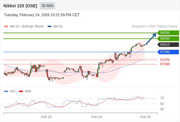 在 57700 之上,看涨,目标价位为 58260 ,然后为 58500 。