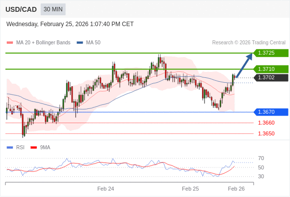 在 1.3670 之上,看涨,目标价位为 1.3710 ,然后为 1.3725 。