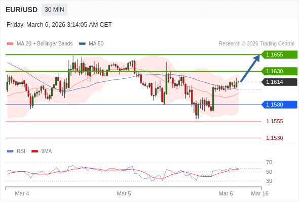 在 1.1580 之上,看涨,目标价位为 1.1630 ,然后为 1.1655 。