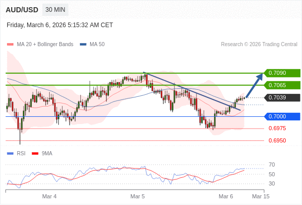 在 0.7000 之上,看涨,目标价位为 0.7065 ,然后为 0.7090 。