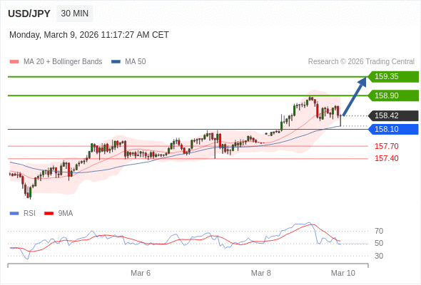 在 158.10 之上,看涨,目标价位为 158.90 ,然后为 159.35 。