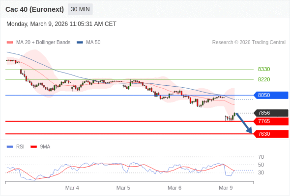法国CAC指数期货 (Euronext) (H6) 当日内: 期待7765。