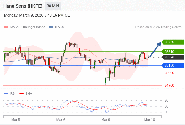 香港恒生指数期货 当日内: 在25180之上,看涨。