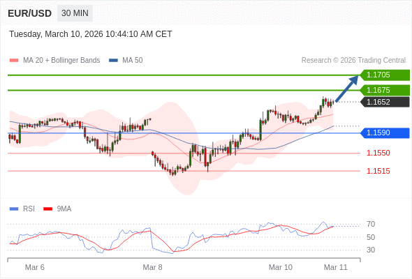 在 1.1590 之上,看涨,目标价位为 1.1675 ,然后为 1.1705 。