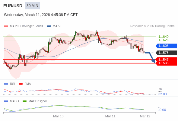 欧元/美元 当日内 : 看跌,在 1.1603 之下。