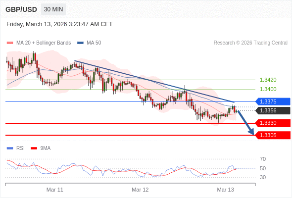 交易策略: 在 1.3375 之下,看跌,目标价位为 1.3330 ,然后为 1.3305 。