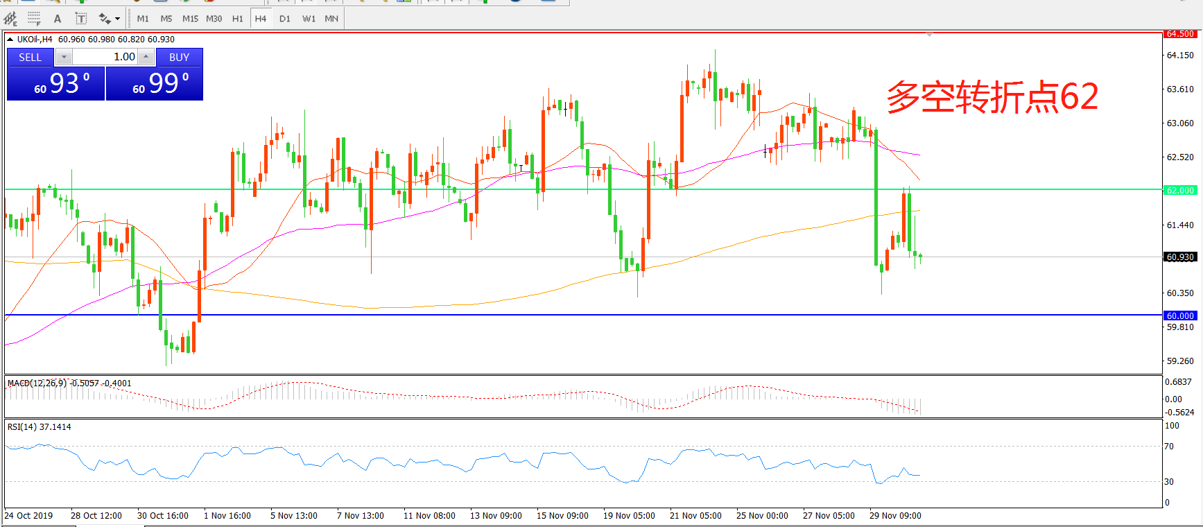交易策略:在62.00之下看跌,目标60.00    57.50