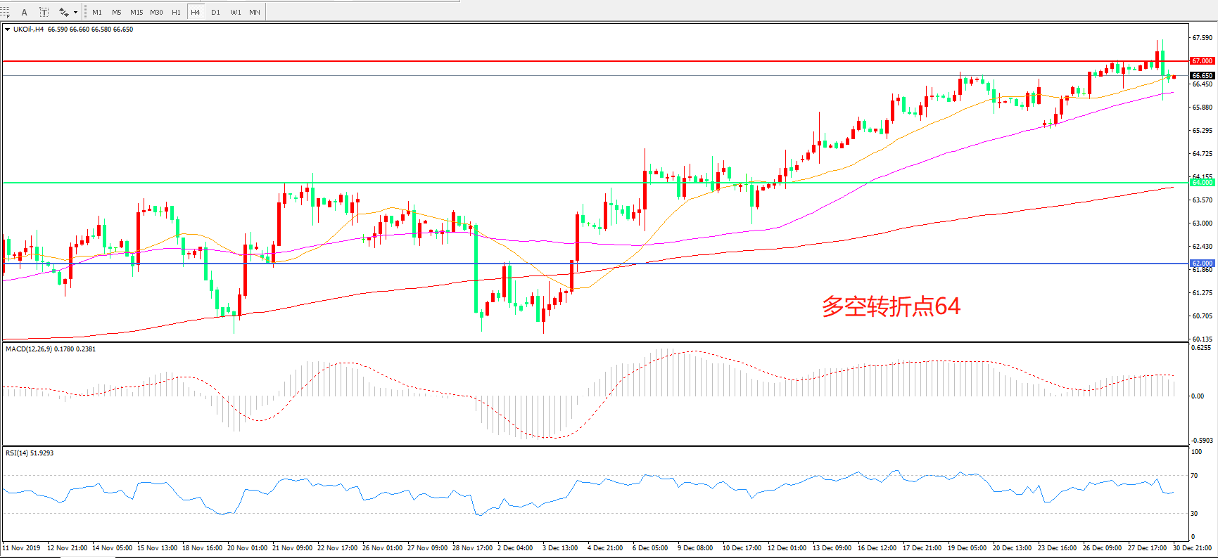 4小时图看,油价呈现高位震荡,67美元成为短线阻力,MACD红柱增加,RSI指标邹平,日内震荡上行概率较大。