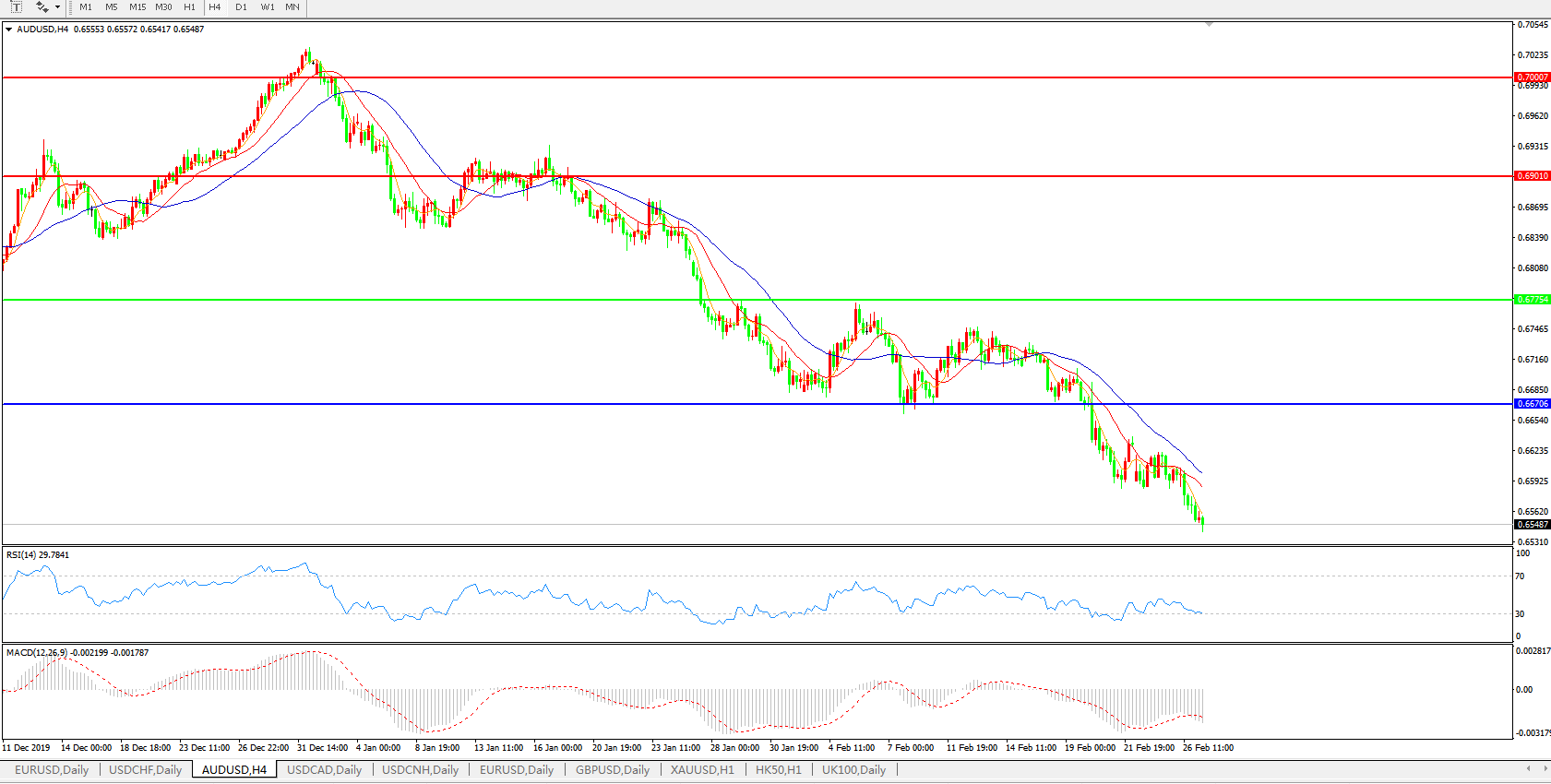 周三(2月26日)澳元兑美元续刷十一年新低至0.6570,现报0.6577,跌幅0.41%。本周以来澳元兑美元围绕着0.6600反复争夺,但是总体而言,疲软的经济数据叠加全球公共卫生事件的不确定性,加上自然灾害也对该国的经济造成压力,因此日内澳元继续走低。下周三(3月4日)澳洲将公布第四季度GDP数据,继就业和通胀数据后,这是市场最为关注的经济数据,如果有更多的迹象显示澳洲经济处于进一步衰退的边缘,将会强化市场对于澳洲联储近期降息的预期,可能会推动澳元进一步滑向11年新低0.6530附近。