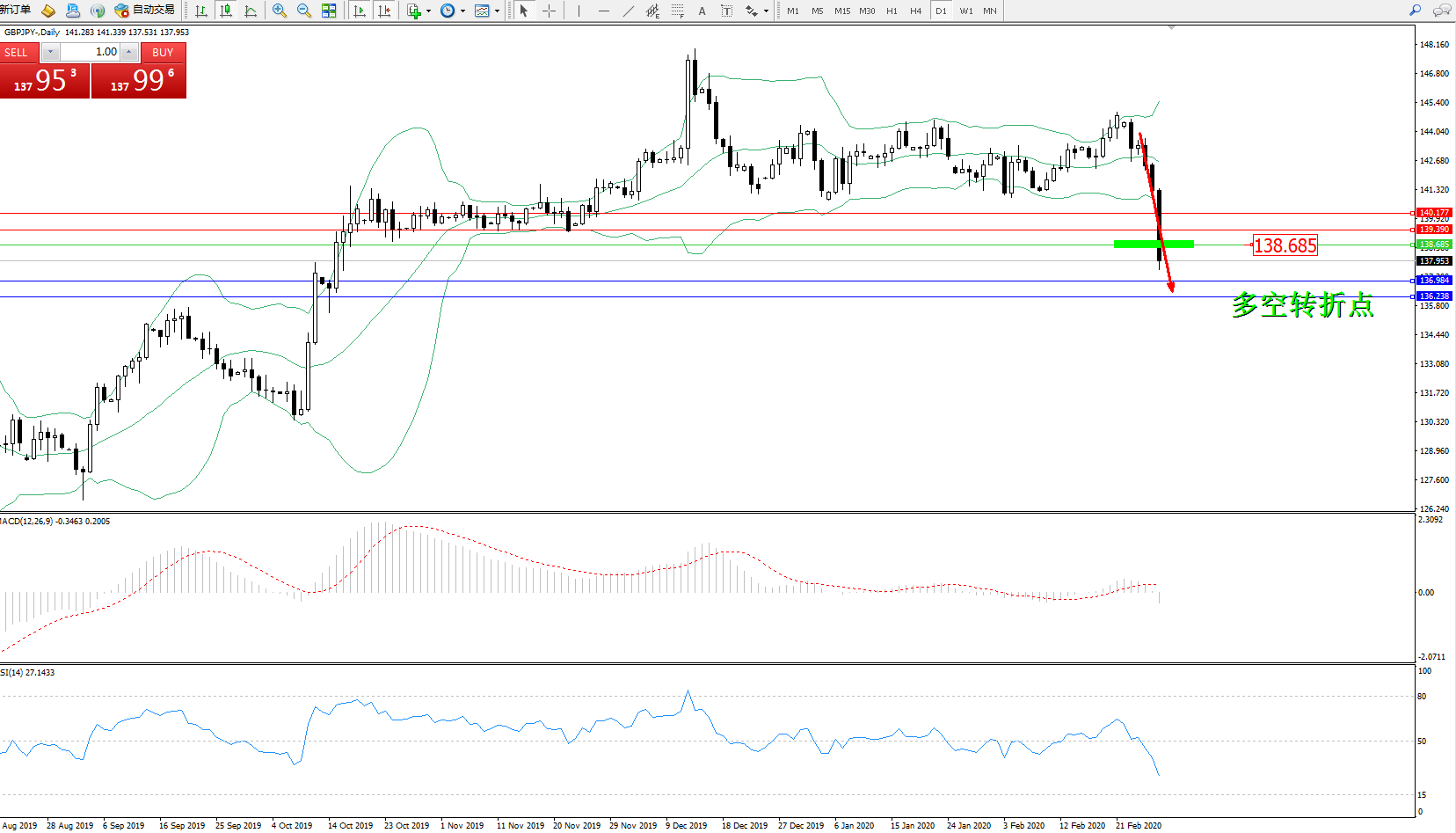 交易策略:138.685下方看跌,目标136.984、136.238