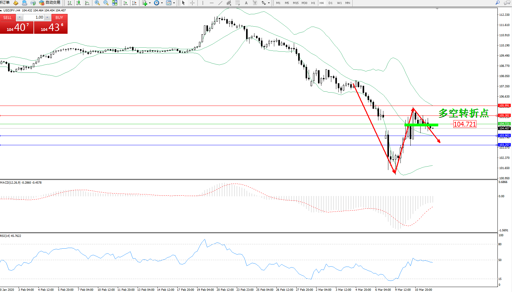 交易策略:104.721下方看跌,目标103.903103.257