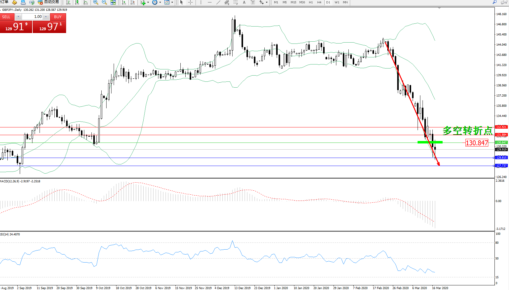 交易策略:130.847下方看跌,目标128.815127.737