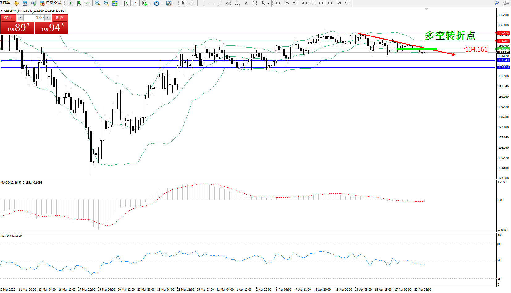 交易策略:134.161下方看跌,目标133.243132.673