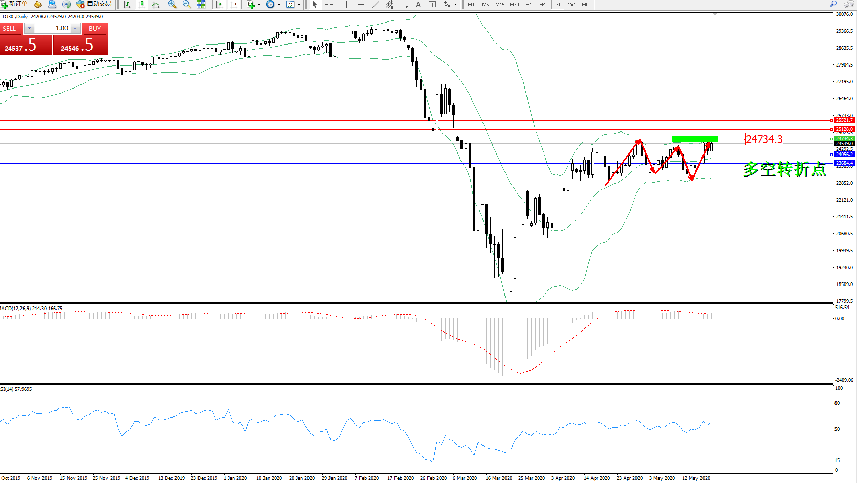 道琼斯指数5月20日(周三)收盘上涨369.00点,涨幅1.52%,报24575.90点。美国股市周三收创逾10周高点,能源、金融和科技股领涨投资者关注美国经济将继续重启的迹象。美联储周三公布的会议记录显示,委员们同意美联储致力于使用所有工具支撑经济,委员们预计将维持当前的利率目标区间,直到他们确信经济已经经受住了近期事件的冲击,并走上了实现美联储目标的轨道上;公开市场调查的受访者认为,FOMC实施负利率的可能性几乎为零。自3月中各州开始实施居家令以减缓病毒传播以来,已有超过3600万美国人请领失业金。经济学家预计失业率将接近或超过大萧条时期创下的25%的纪录。预测人士称,他们预计本季美国经济环比年率将萎缩高达50%。