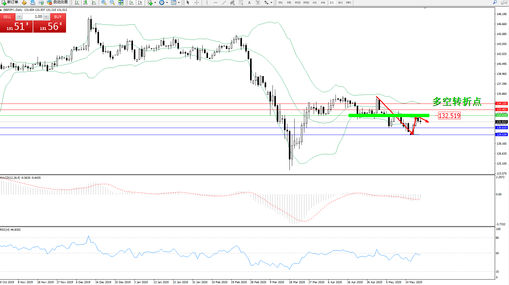 交易策略:132.519下方看跌,目标130.610、129.539