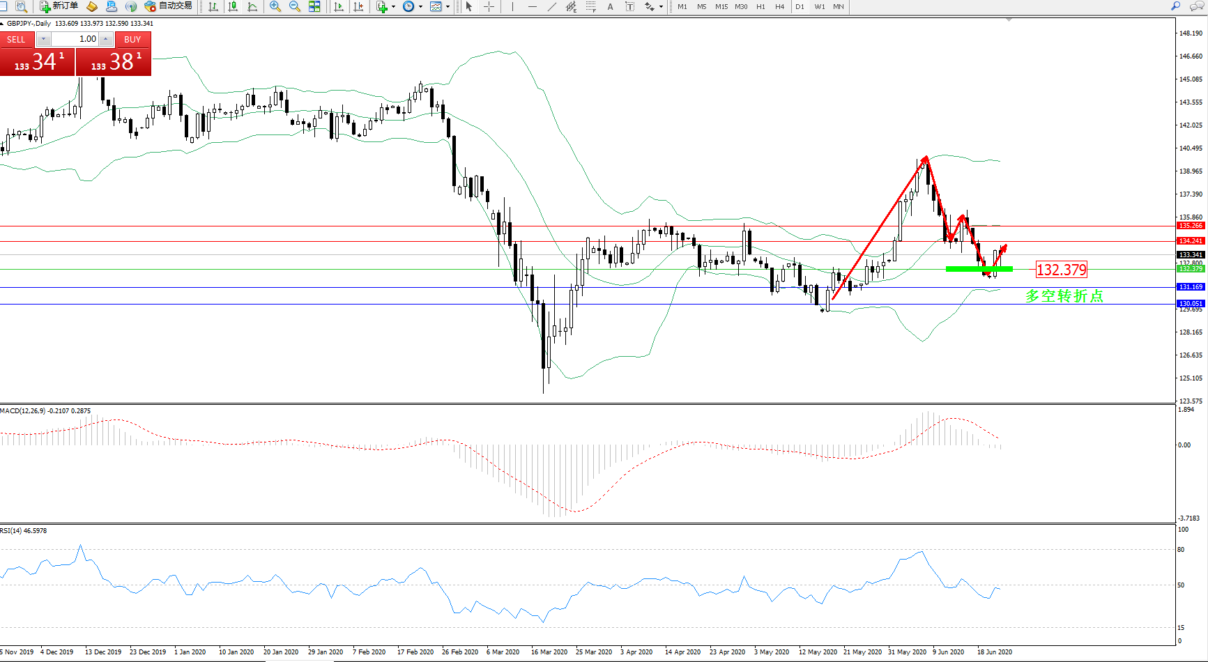 交易策略:132.379上方看涨,目标134.241、135.266