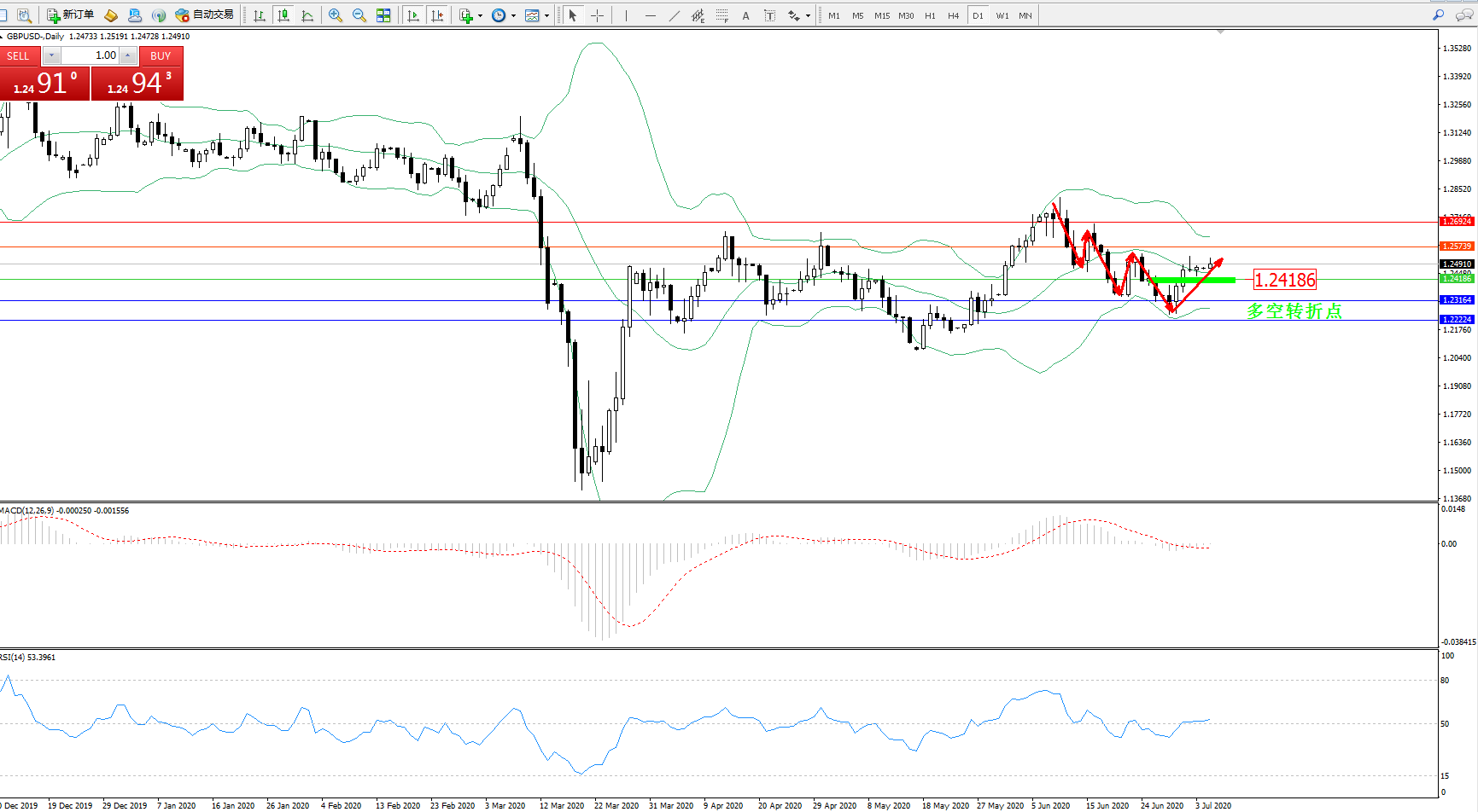 交易策略:1.24186上方看涨,目标1.25739、1.26924