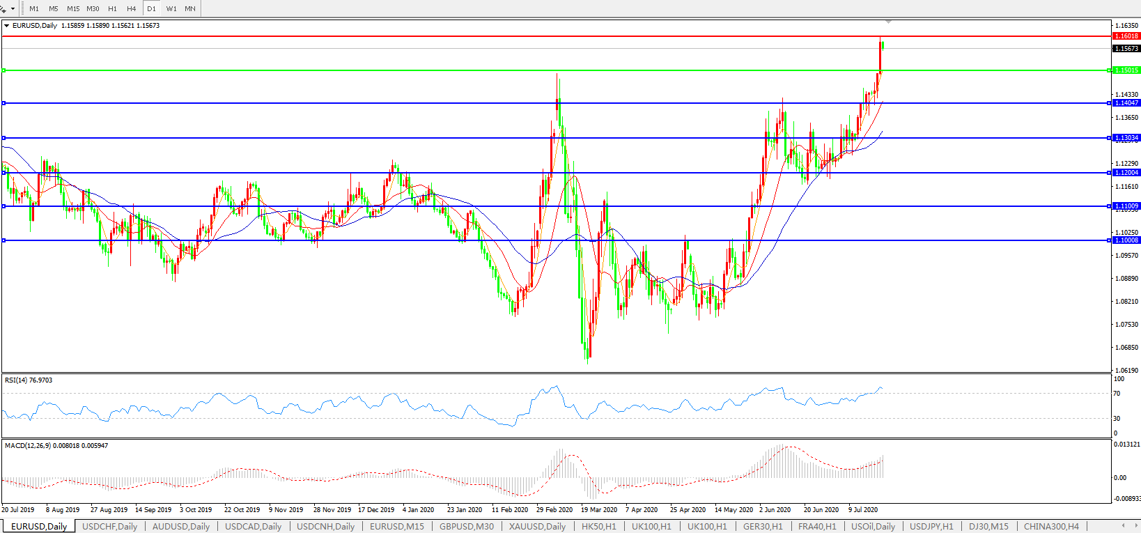 在欧盟同意设立7,500亿欧元复苏基金以分担疫情危机期间产生的债务后,市场人气基本保持乐观,欧元兑美元连续第四天上涨。欧元兑美元尾盘升0.37%,报1.1570,盘中触及2018年10月来最高1.1601,高于2018年至2020年跌势的50%斐波那契回撤位(1.1595)。德意志银行George Saravelos报告援引商品期货交易委员会数据称,市场持仓“表明仍在空头回补的过程中”,此外,他写道,美国和全球数据意外正在开始转变,这是一个潜在信号,表明疲软的美元趋势将加速,预计欧元将升至1.20。