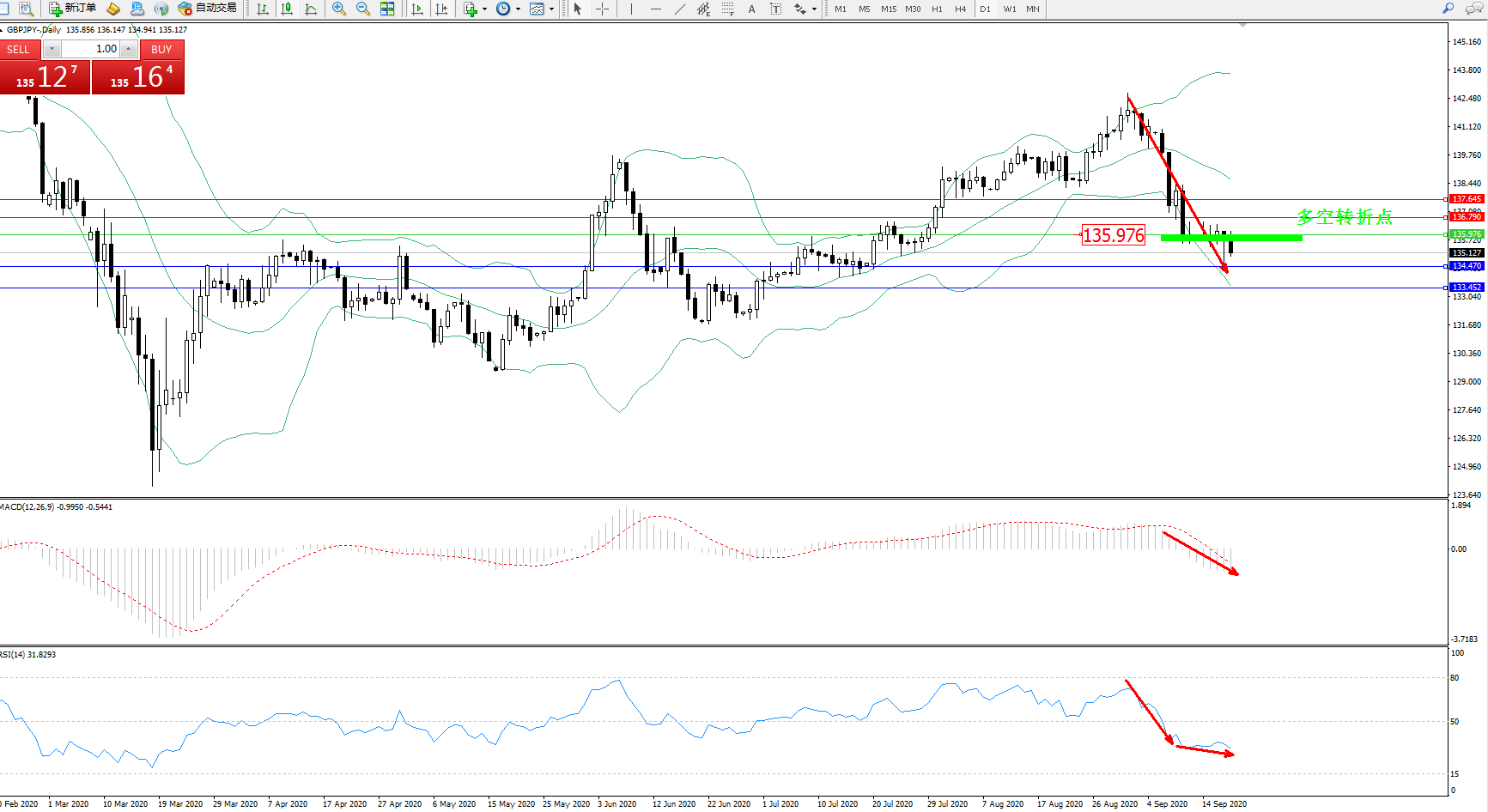 交易策略:135.976下方看跌,目标134.470、133.452