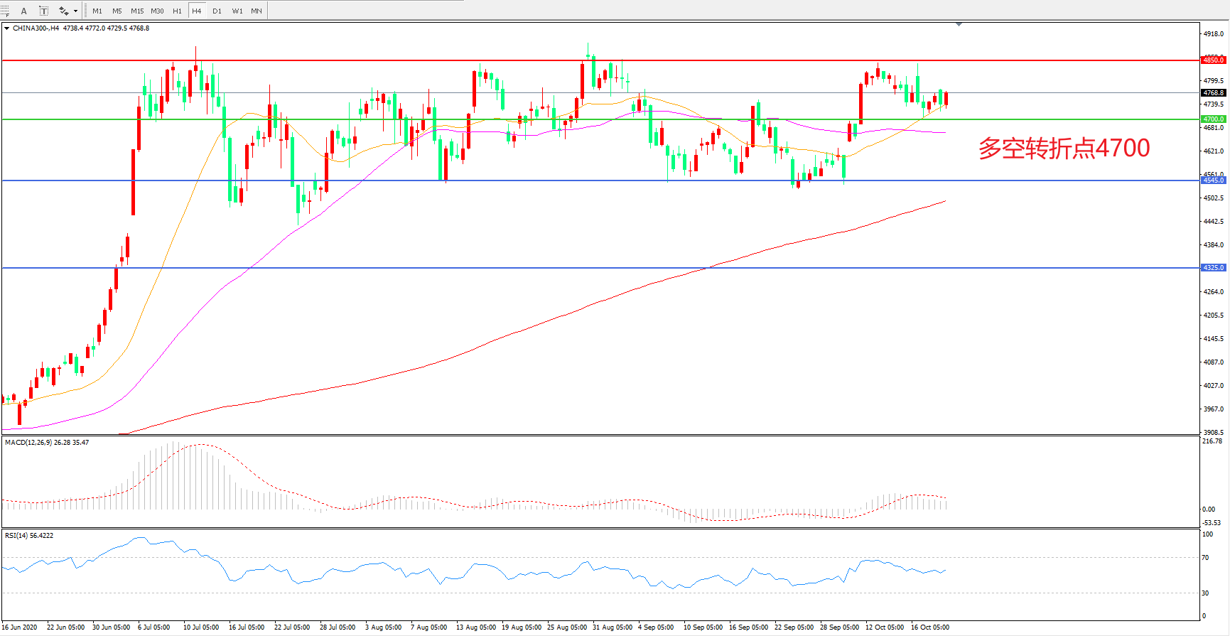 4小时图看,沪深300延续高位震荡,4850成为明显阻力,21周期均线成为短期支撑,均线系统走平, MACD红柱增加,RSI指标向上,日内延续震荡概率较大。
