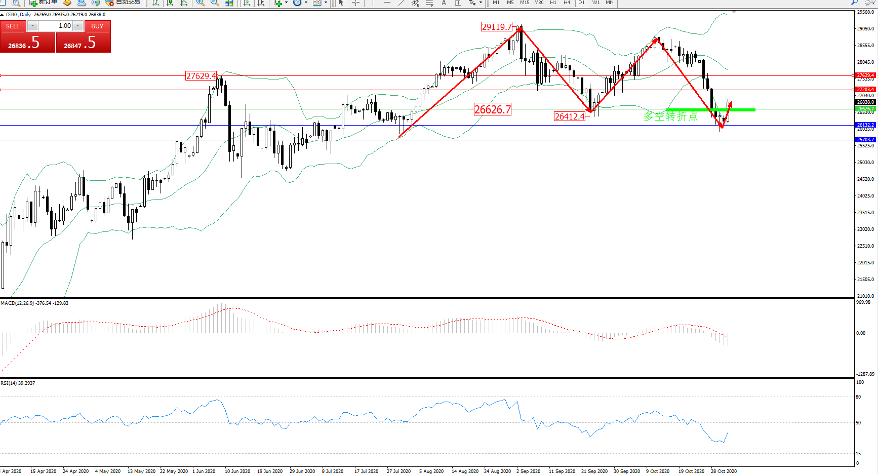道琼斯指数DJ30—— 日K线图显示: