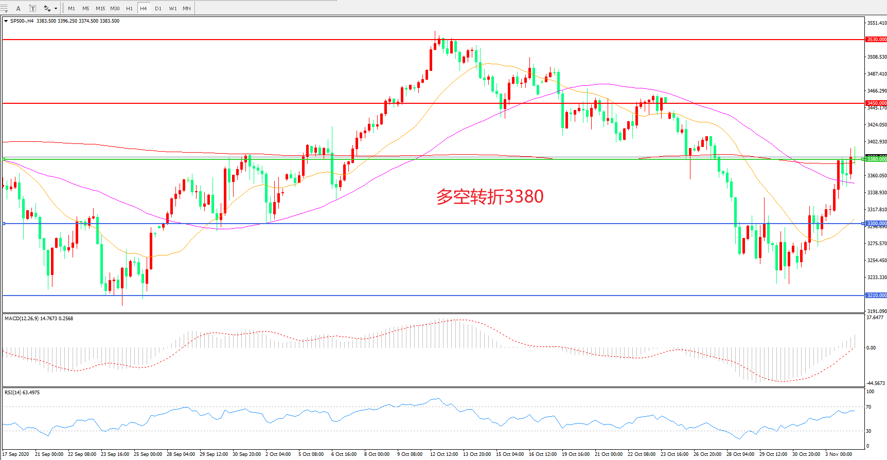 周二(11月3日),美国选民的投票日开启,目前的民调普遍预计,拜登有望入主白宫,在市场对美国大选“速战速决”的期待中,市场风险情绪回暖,标普500大幅上行,收报3380点,创10月27日以来收盘新高。大选科技股全线收涨, 微软涨超2%,苹果、Facebook、亚马逊均涨超1%。
