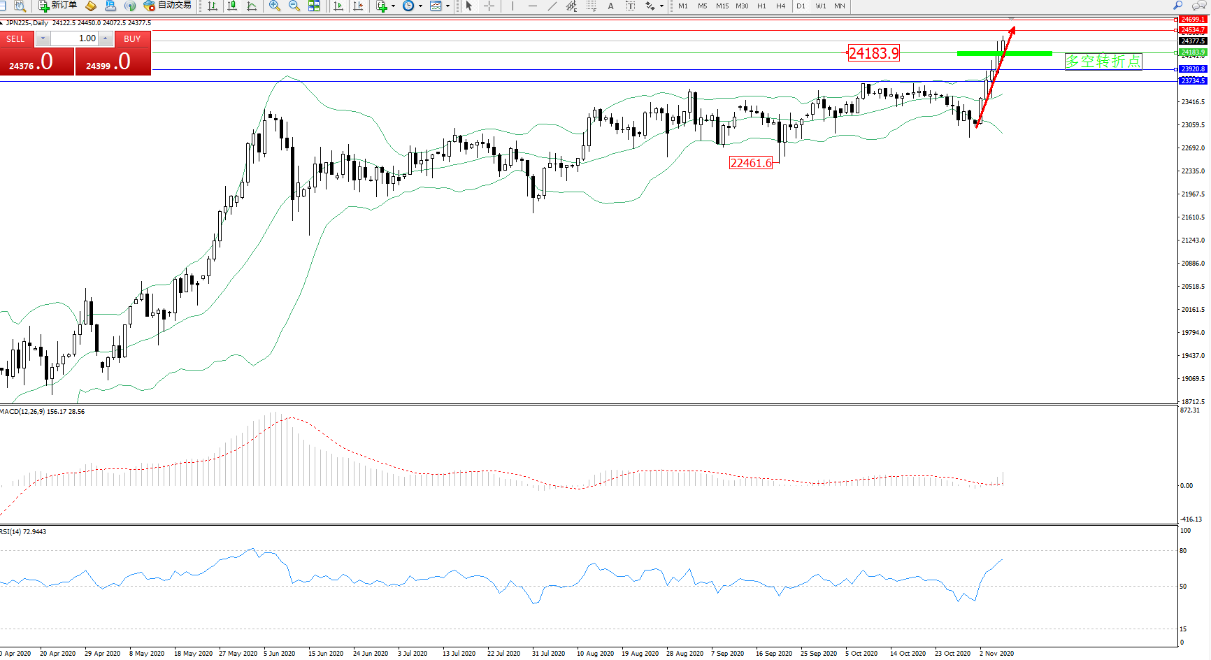 日经指数JPN225——日K线图显示: