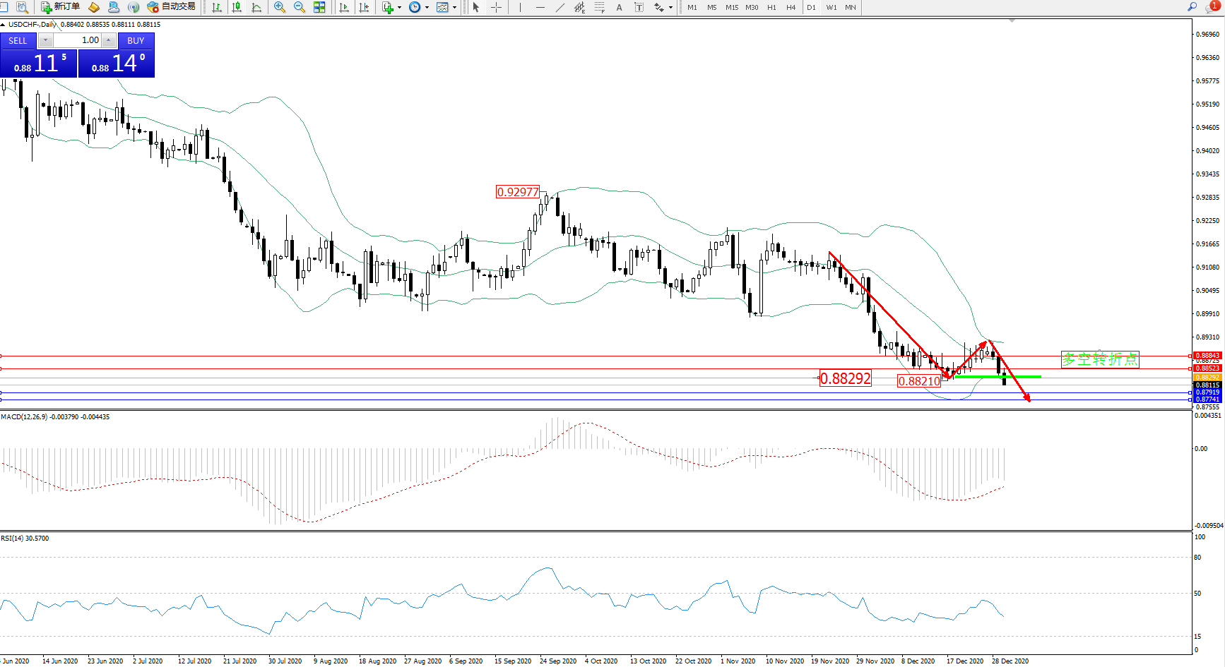 技术点评:空头动力维持在布林带指标通道内弱势震荡持续下行中,跌破前期低位0.88210位置后有继续下行态势,跌势未见止步迹象,布林带指标呈收口走势后开始有张口迹象,延续不离电脑指标下轨附近继续下探,MACD指标处于0轴线下方空头区域维持震荡走势中,RSI指标处于50均衡线下方空头区域维持震荡后有继续向下移动走势迹象;