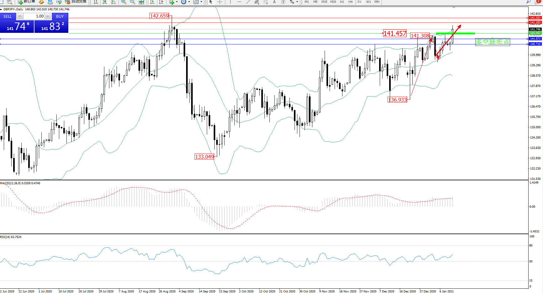 交易策略:141.457上方看涨,目标142.183、142.503