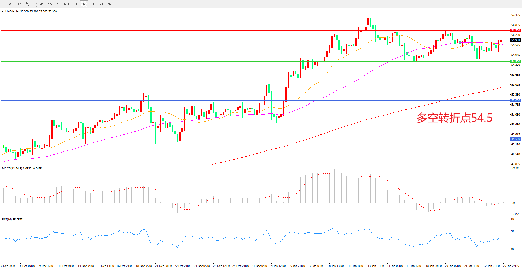 交易策略:  在54.50之上看涨,目标56.50    60.00