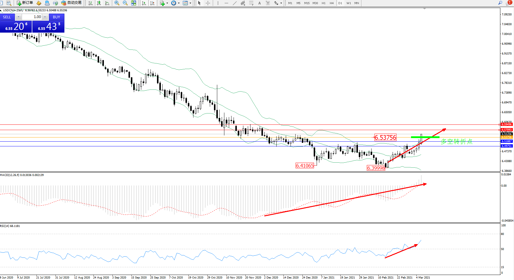 交易策略:6.53756上方看涨,目标6.57093、6.59496