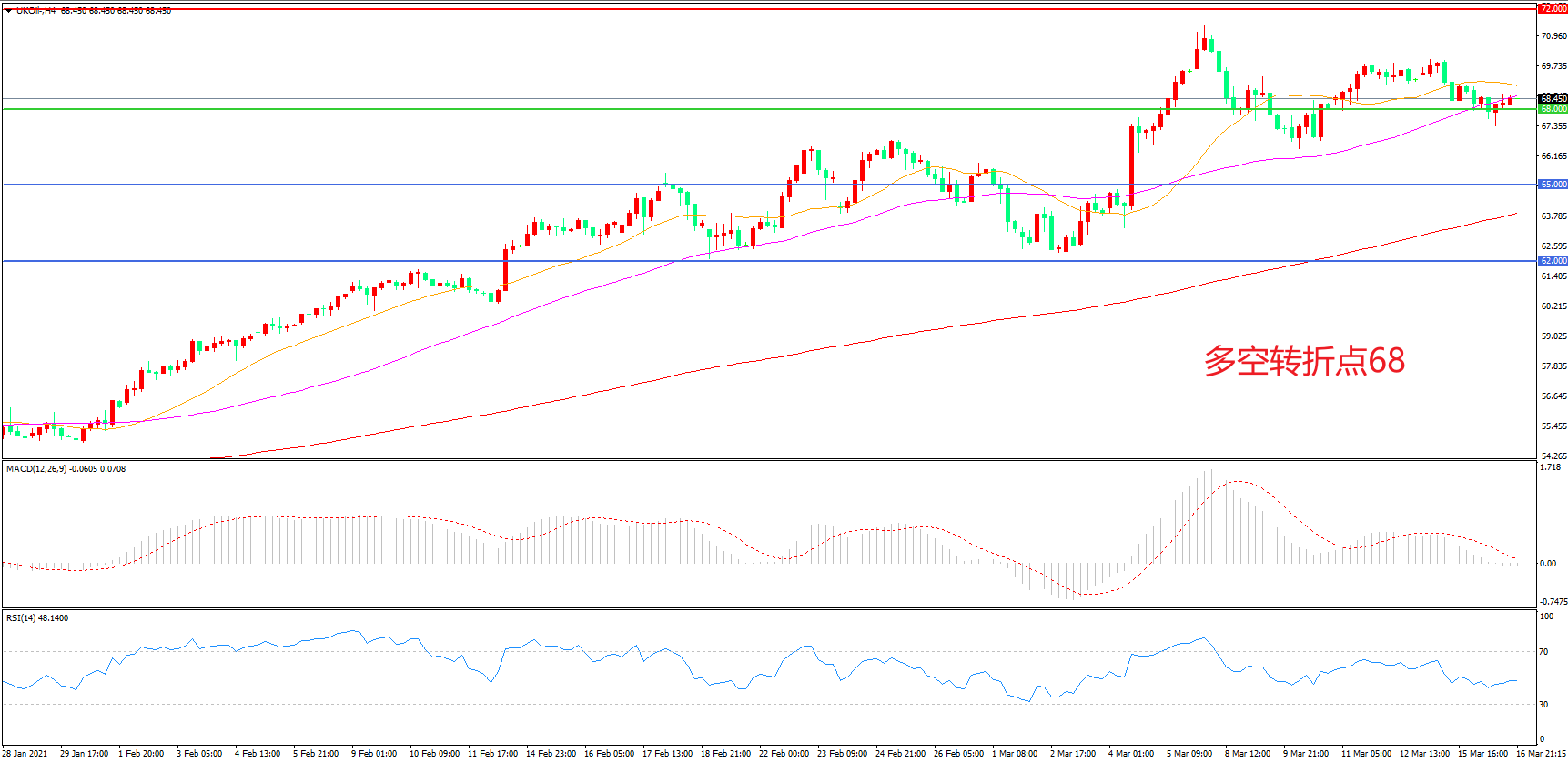 4小时图看,油价以55周期为依托延续高位震荡,整体波幅不大,68美元成为下方支撑,70美元成为短期阻力,MACD红柱缩短,RSI指标走平,日内延续震荡概率较大。
