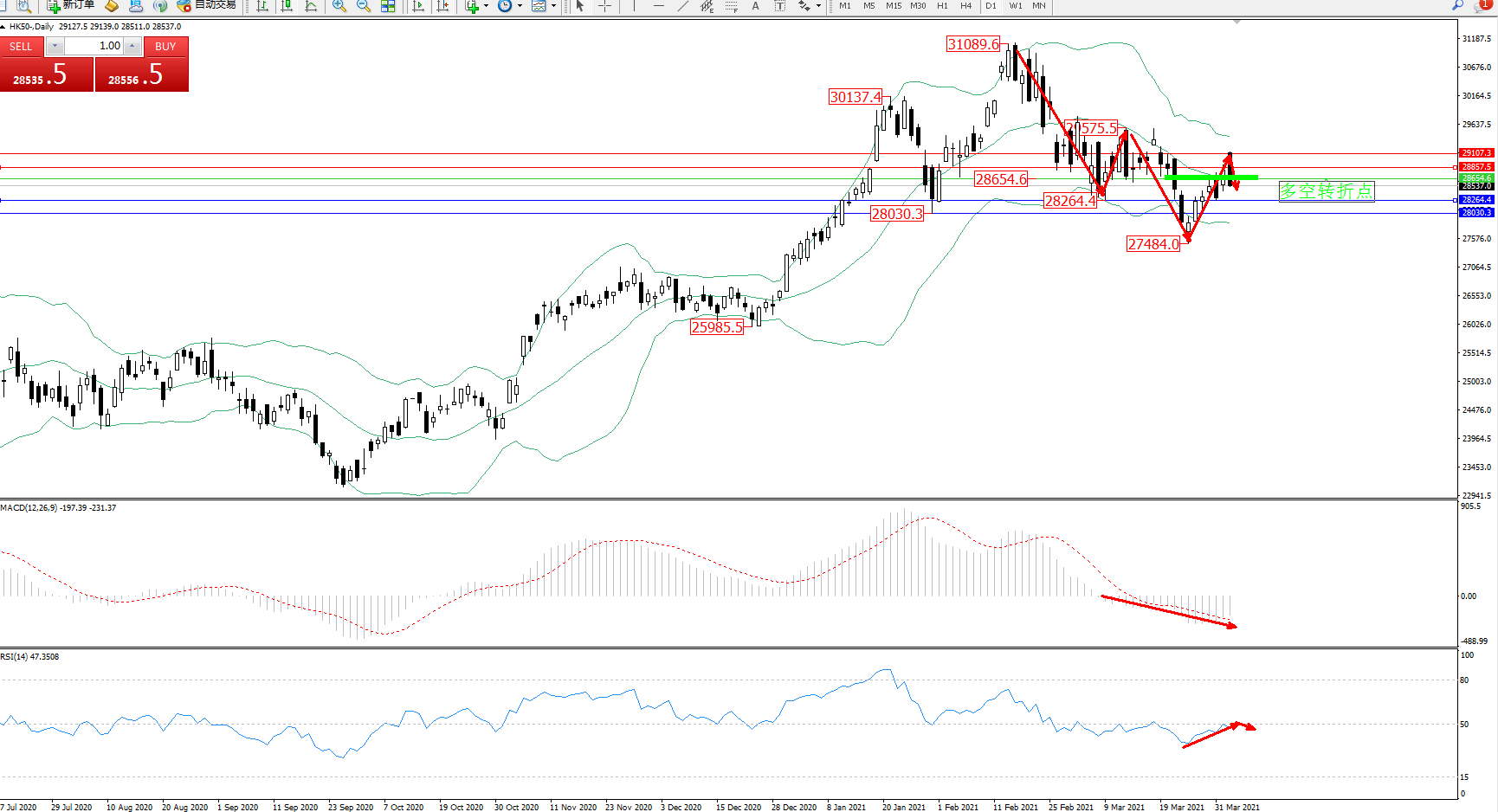技术点评:高位空头动力延续布林带指标通道中下轨区间持续震荡下行,低位抵达27484位置节点后快速回升,纠结于中上轨区间震荡后急速下行,布林带指标呈收口平缓慢下移走势称持续中,关注中轨附近节点,MACD指标处于0轴线下方空头区域维持整理平移,RSI指标处于50均衡线附近弱势徘徊中;