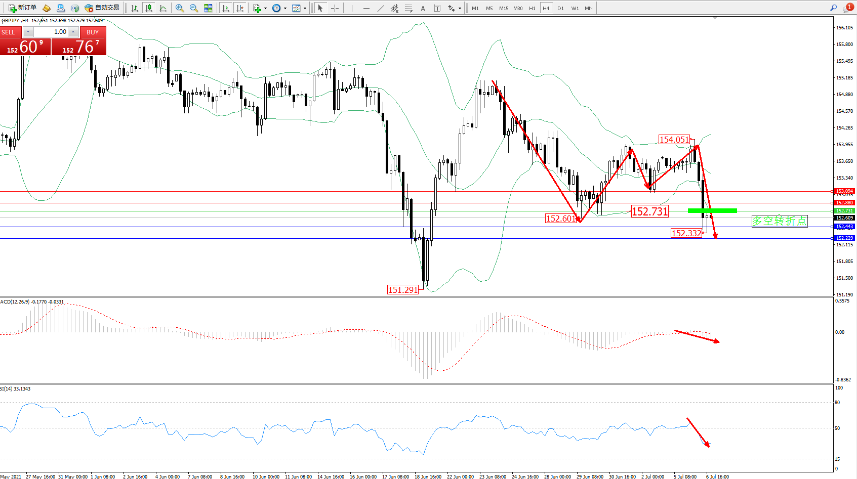 交易策略:152.731下方看跌,目标152.443、152.229
