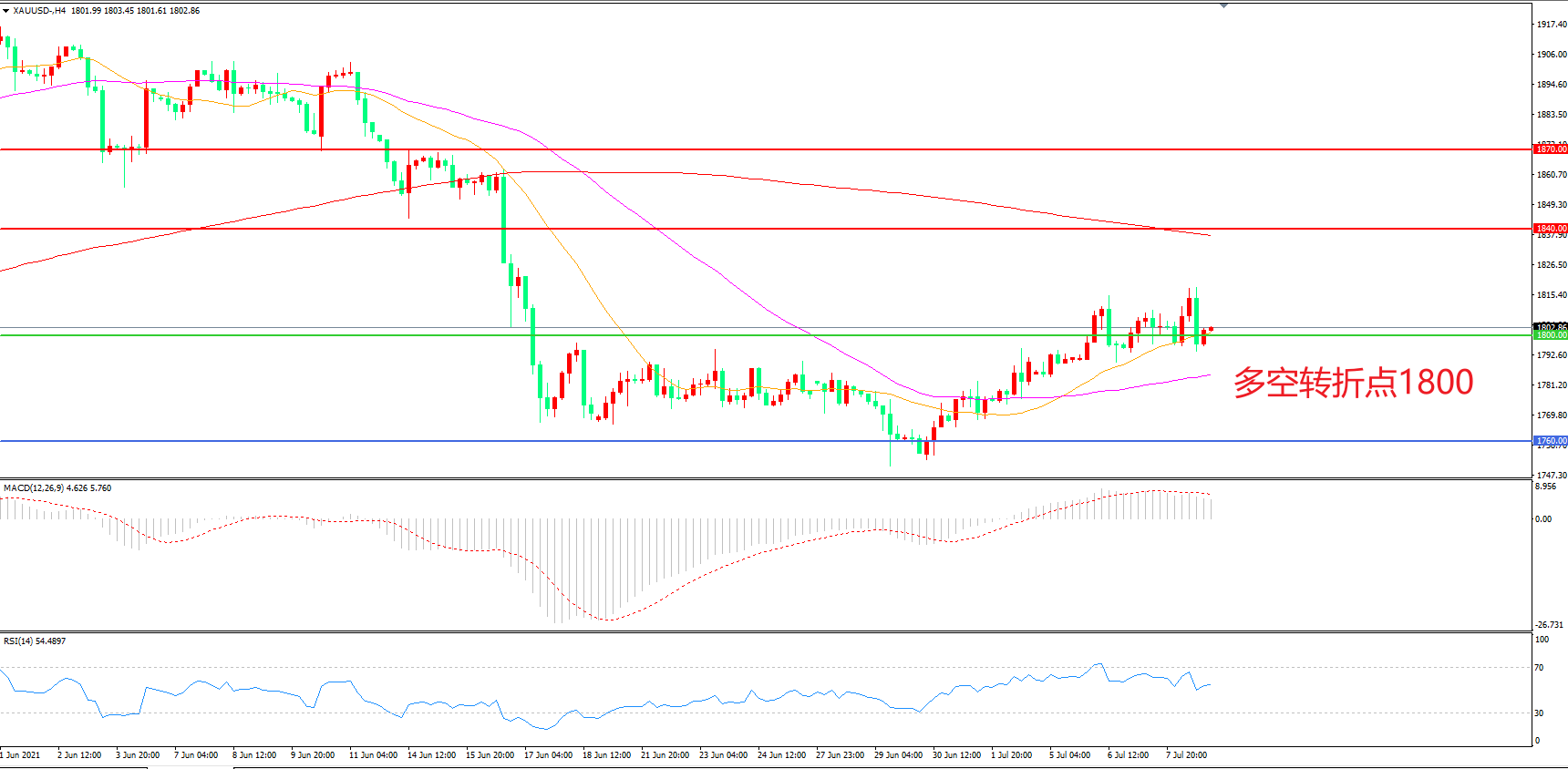 交易策略: 在1800.00之上看涨,目标1840.00 1870.00