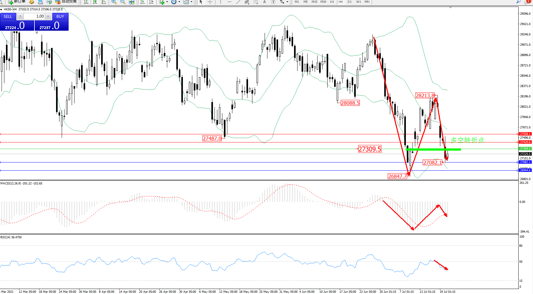 恒指HK50 ——4小时K线图显示:
