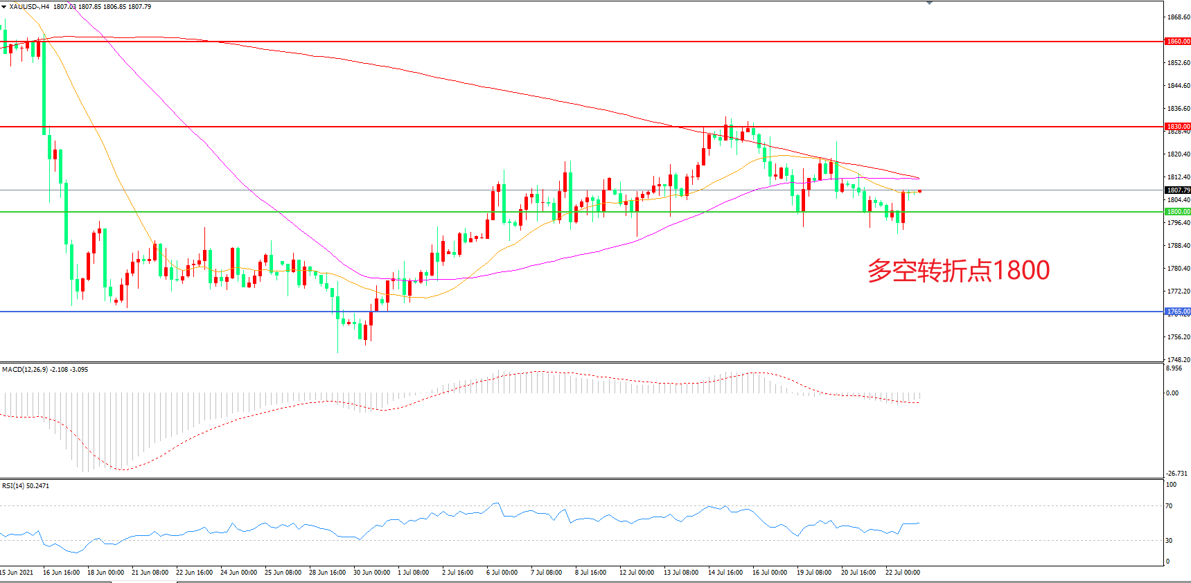 交易策略:  在1800.00之上看涨,目标1840.00         1870.00