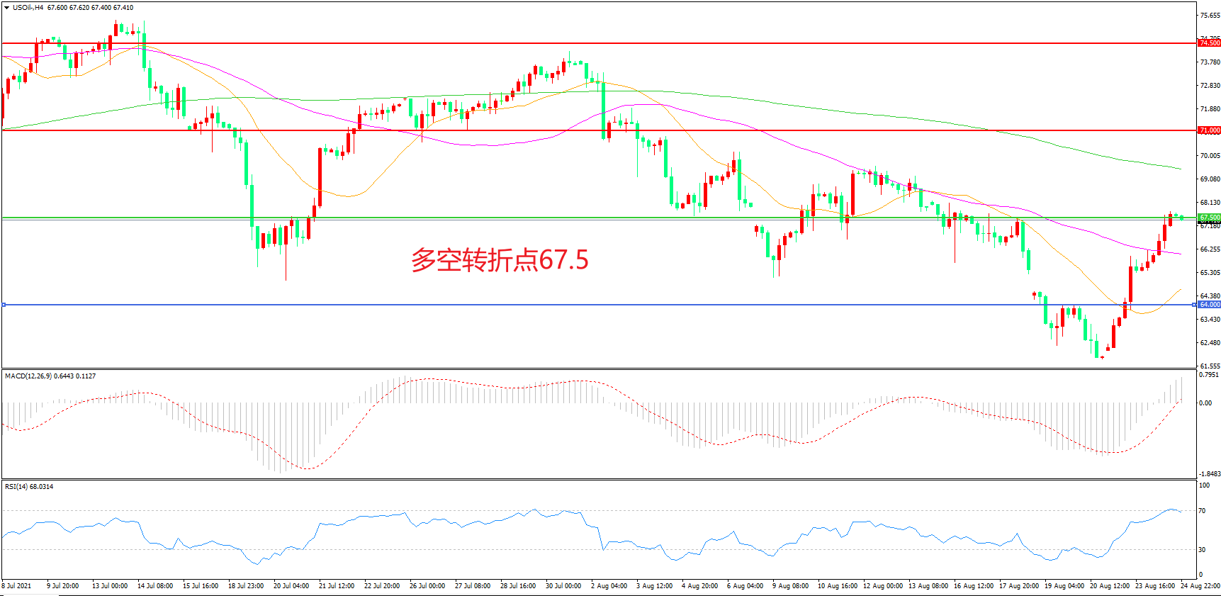 交易策略:在67.50之上看涨,目标71.00                74.50