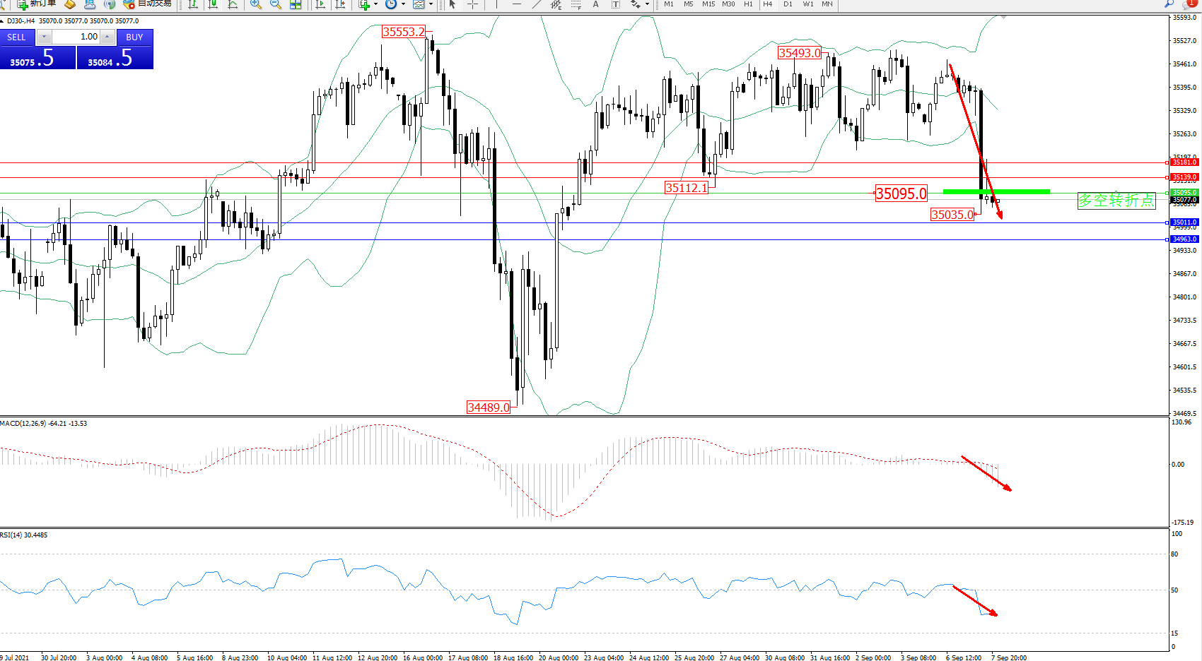 道琼斯指数DJ30——4小时K线图显示:
