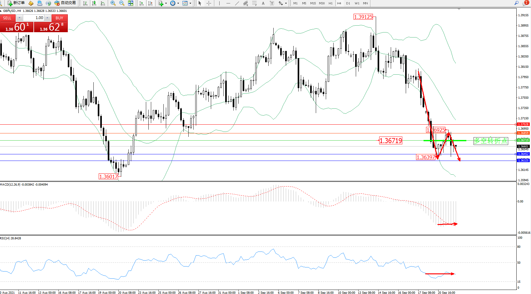交易策略:1.36719下方看跌,目标1.36452、1.36325