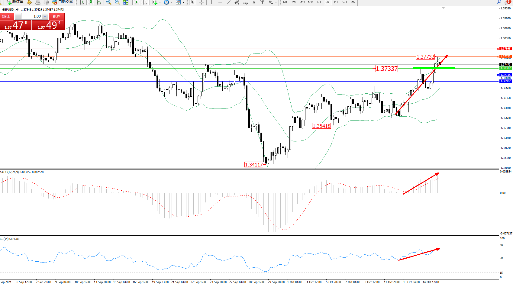 交易策略:1.37337上方看涨,目标1.37732、1.37995