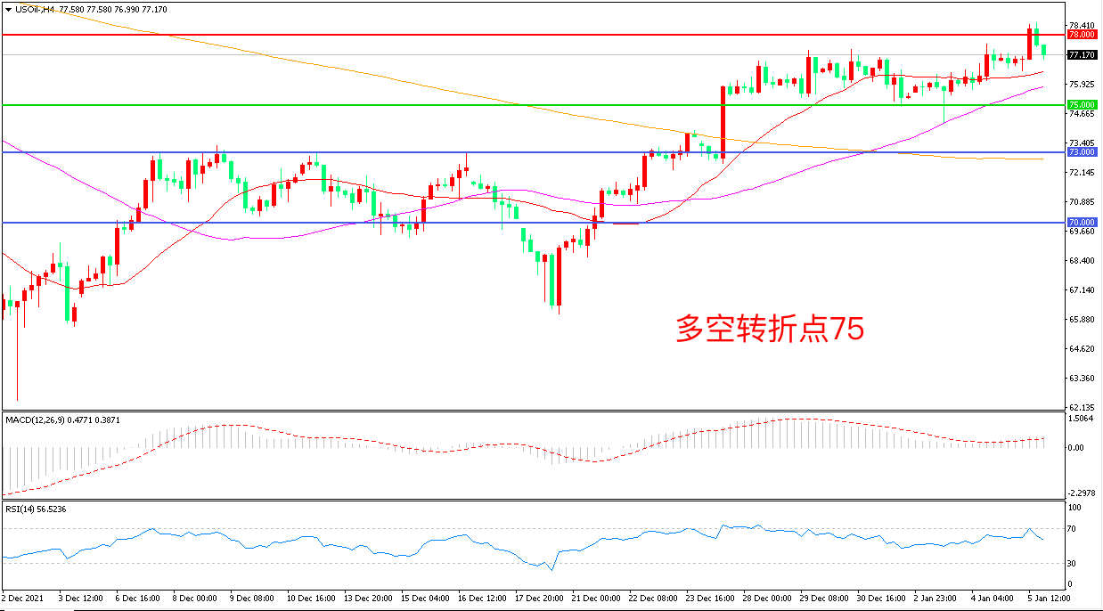 周三(1月5日),根据美国能源信息署公布数据显示,当周EIA原油库存意外下降643.2万桶,远超市场预期,美国WTI原油延续强势表现,收报77.00美元/桶。但值得注意的是美国汽油库存增创下2020年4月份以来最大单周增幅显示成品油市场的需求可能有所放缓,在全球原油产量缓慢回升的背景下,油价延续震荡的可能性较大。