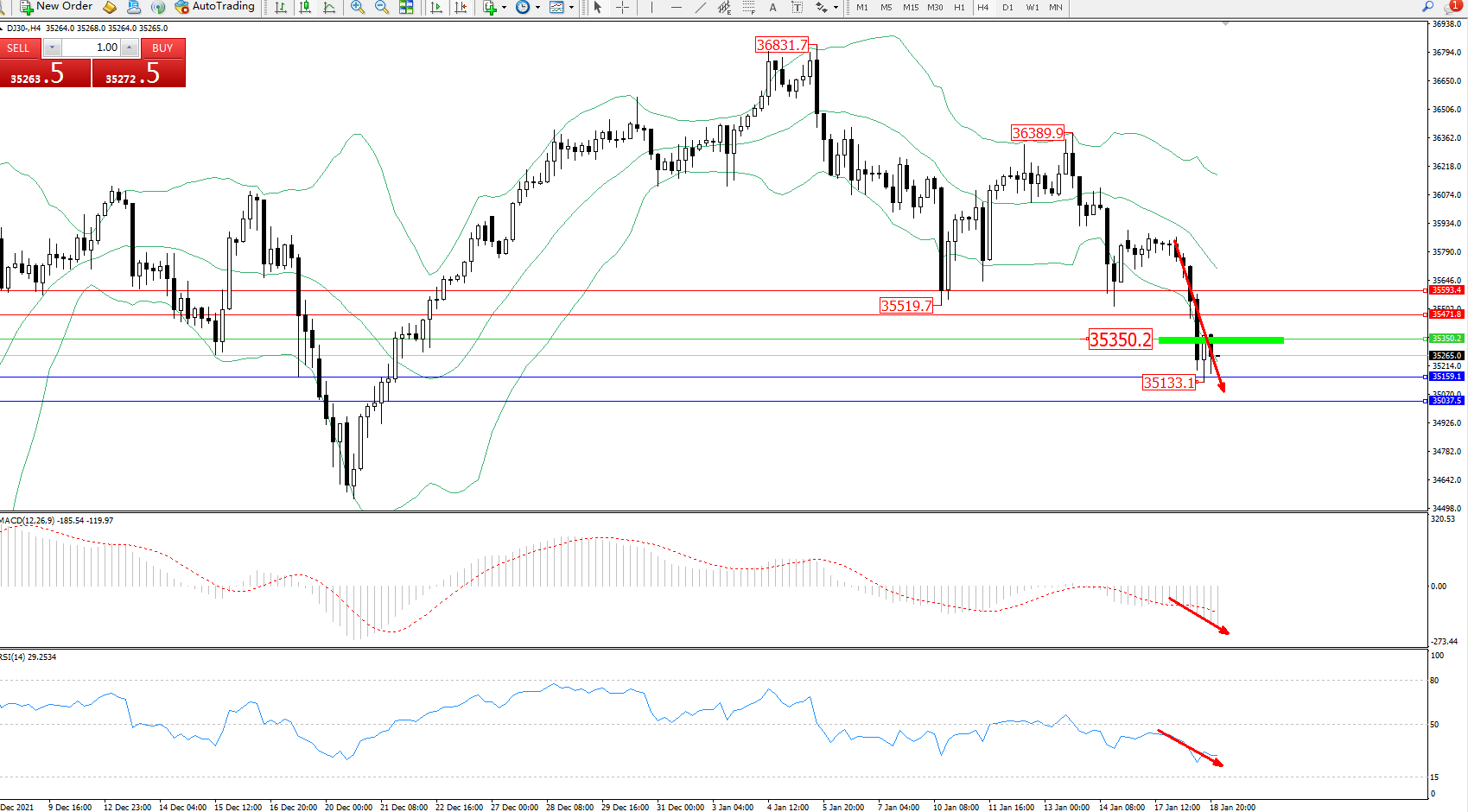 交易策略:35350下方看跌,目标35159、35037