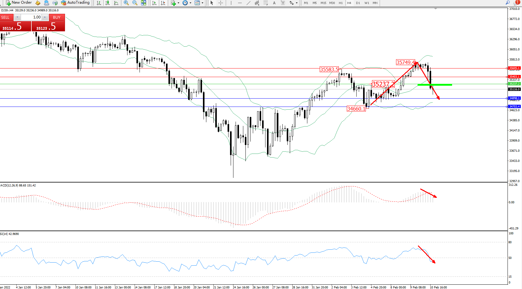 交易策略:35237下方看跌,目标34898、34703